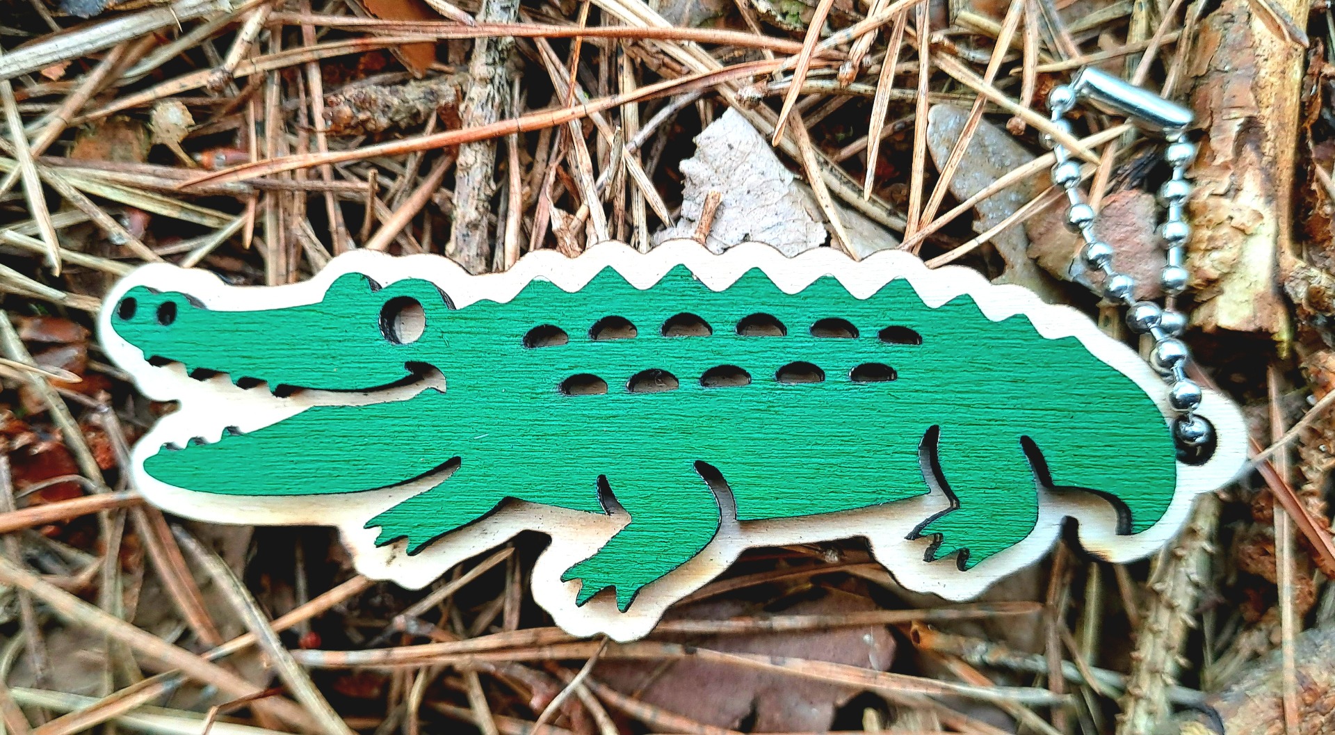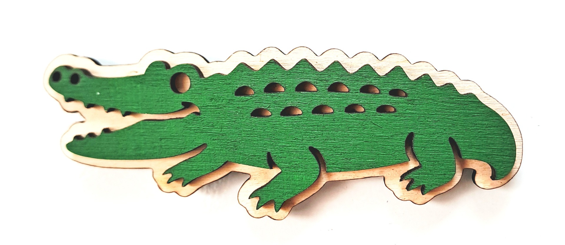 Magnet nebo přívěsek na klíče s řetízkem z překližky v podobě krokodýla, vhodný na magnetickou tabuli, ledničku nebo jiný kovový povrch nebo jako přívěšek na klíčový kroužek.