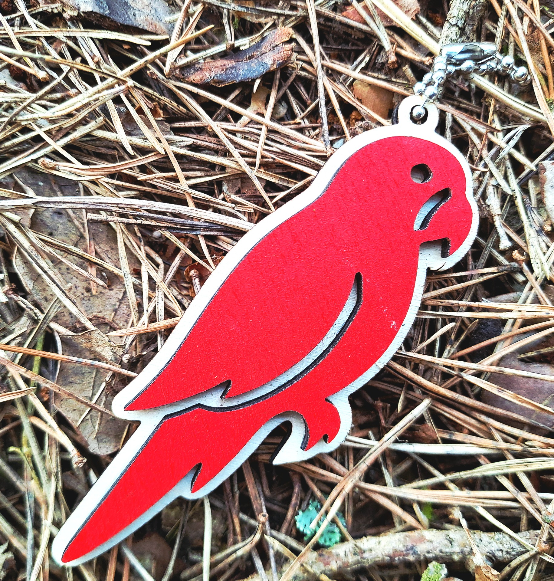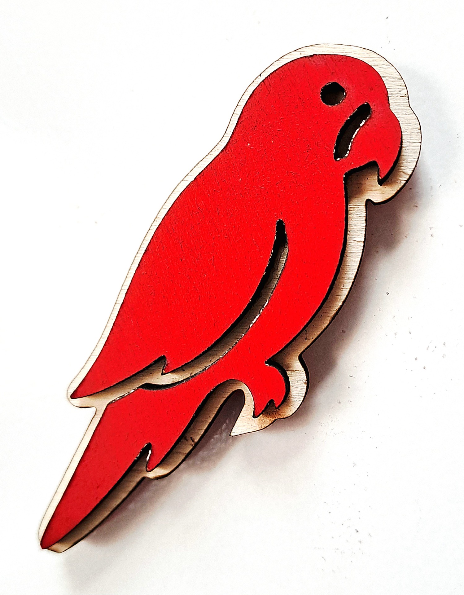 Magnet nebo přívěsek na klíče s řetízkem z překližky v podobě papouška, vhodný na magnetickou tabuli, ledničku nebo jiný kovový povrch nebo jako přívěšek na klíčový kroužek.