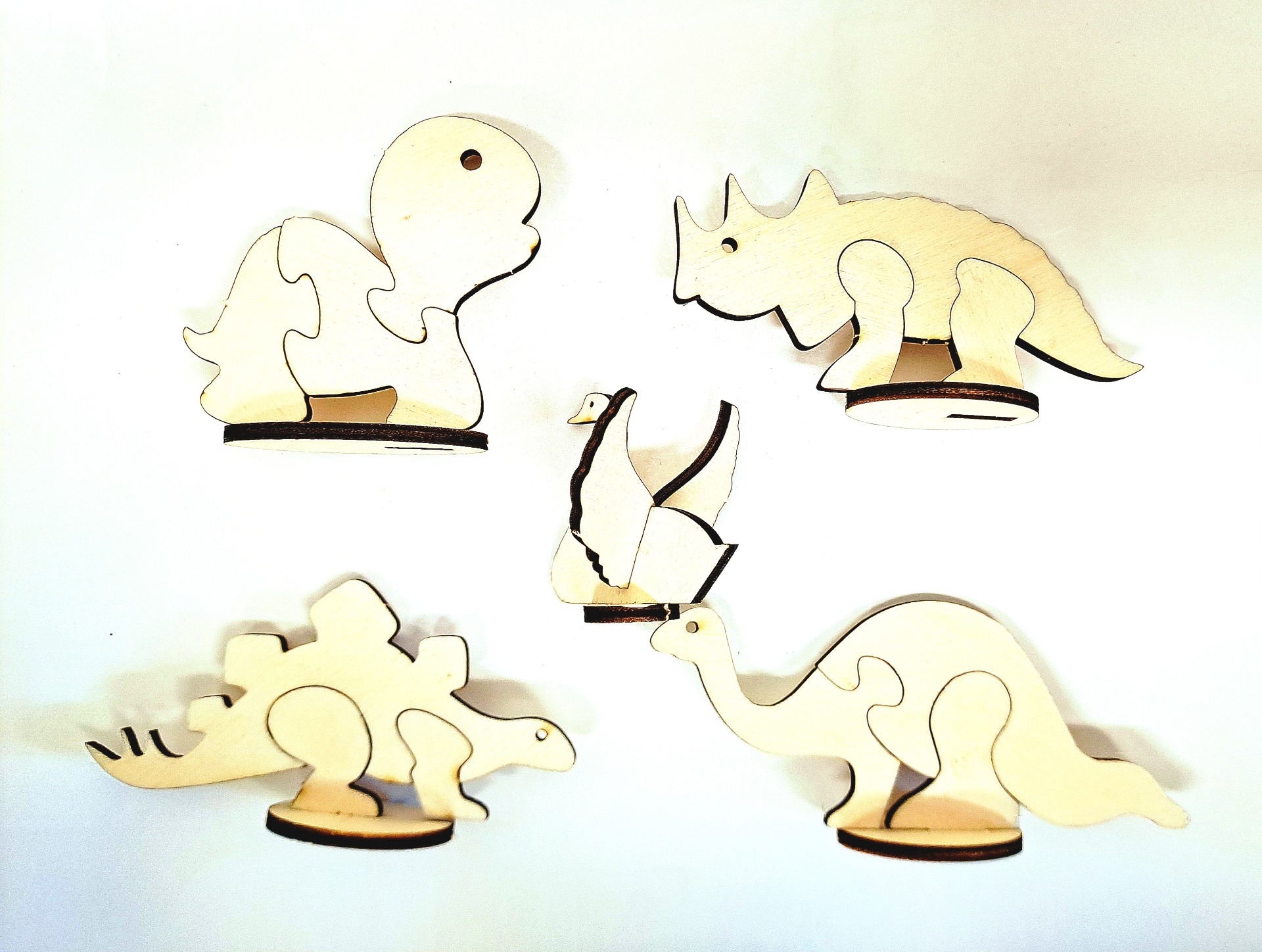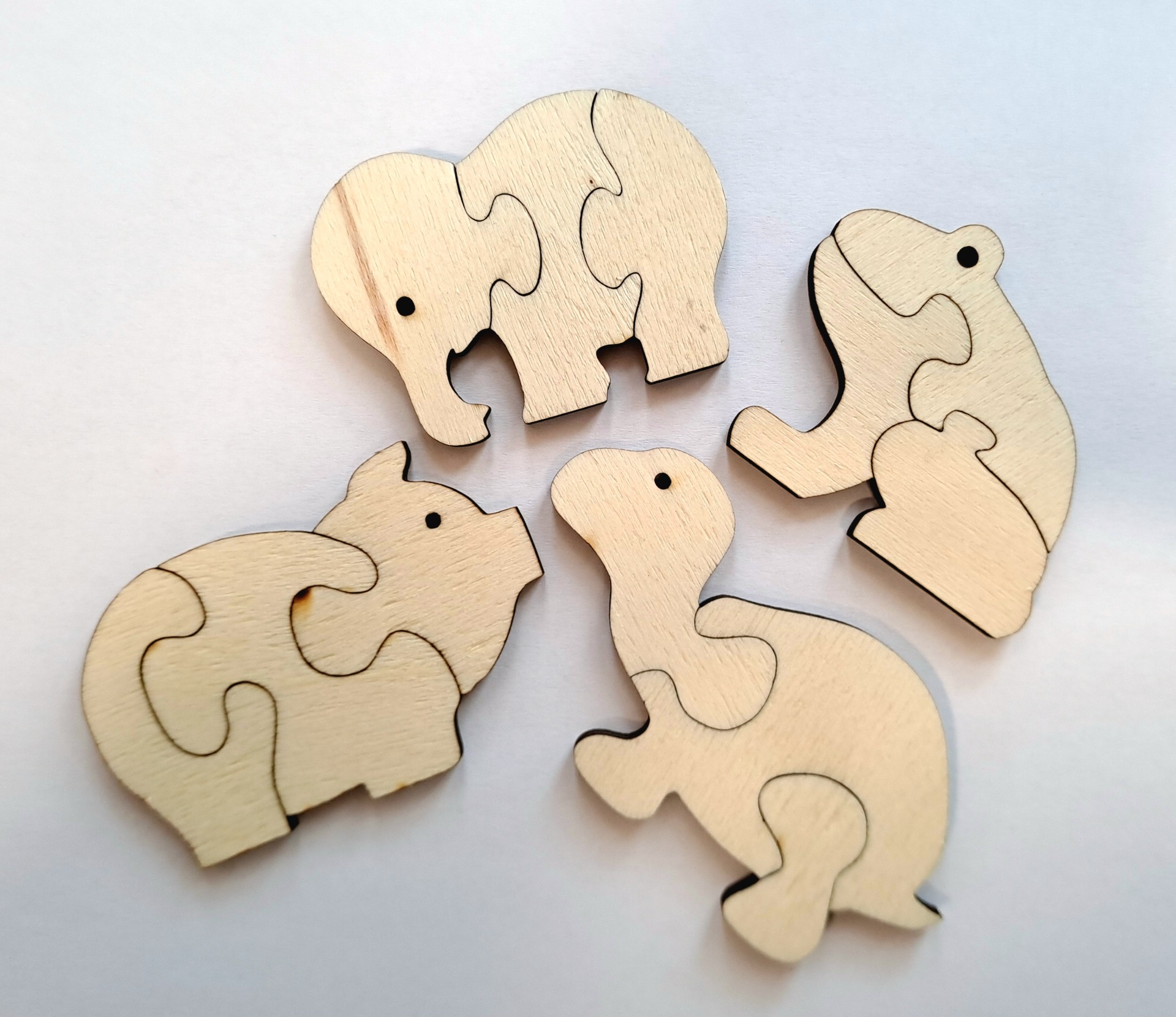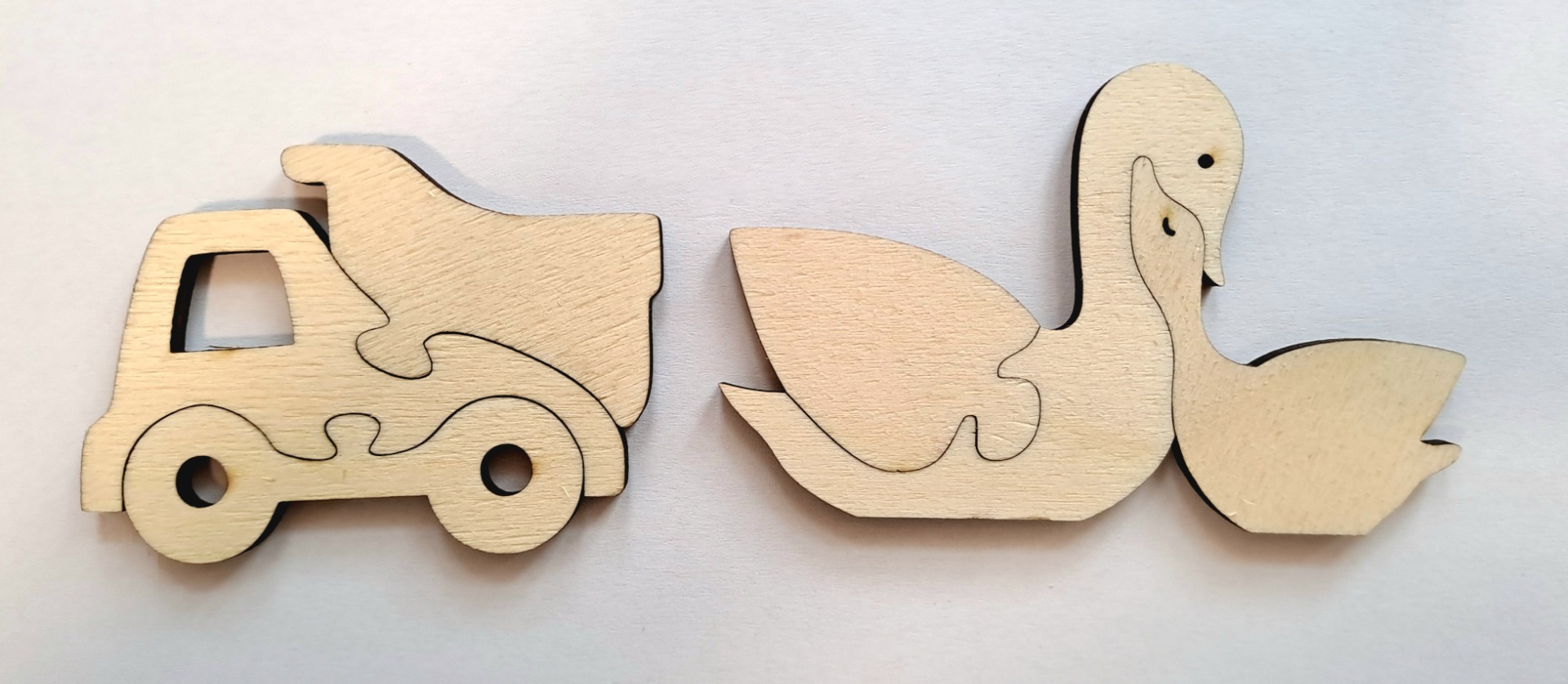 Destičky s dílky pro složení jednoduchých puzzle. Překližka tl. 3 mm. Nejdříve mohou děti pomalovat pastelkami nebo barvami, poté vyloupnout a složit.